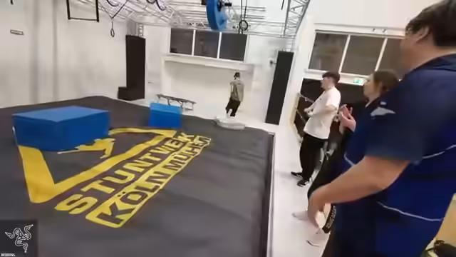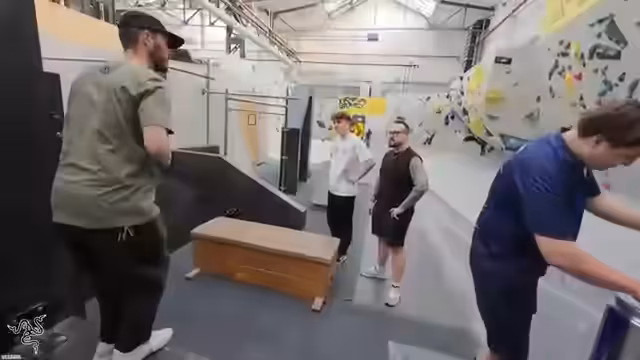 02:18:08Die Gruppe absolviert ein intensives Training an einem interaktiven Boulderparcours. Sie versuchen verschiedene Hindernisse wie einen Überschlag, die Überwindung von engen Räumen und komplexe Kletterstrecken. Dabei müssen sie mit körperlichen und mentalen Herausforderungen wie Höhenangst und Engephobie umgehen. Der Streamer gibt sich selbst große Mühe und motiviert seine Teammitglieder, während er auch seine eigenen körperlichen Grenzen testet.