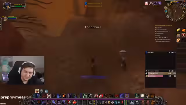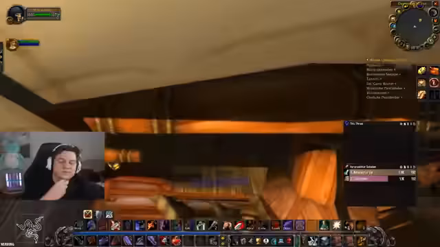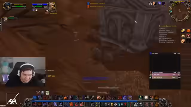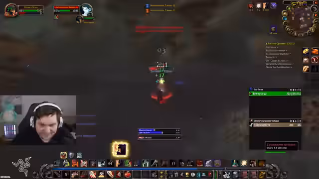 08:54:34Die Suche nach einem verfluchten Magier für eine Quest führt das Gameplay in ein gefährliches Gebiet. Plötzlich erscheint ein Level-60-Elitegegner, der eine Falle stellt und das Team in einen Kampf zwingt. Nach dem sofortigen Fluchtversuch bleibt das Team in Kampf, was zu einer angespannten Situation führt. Der Streamer analysiert die Gefahr und plant einen konzentrierten Gegenangriff mit verfügbaren Cooldowns, um die Bedrohung gemeinsam zu bewältigen.