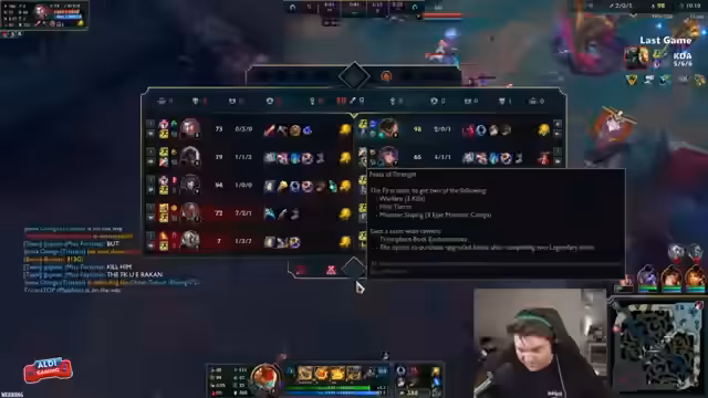 05:33:53Nach der kontroversen Diskussion kehrt der Streamer zum Gameplay von League of Legends zurück. Er spielt wieder Top-Lane, diesmal gegen Shogath. Wegen der AP-Komparschaft im Team wird Gangplank gewählt. Das Verhältnis von AR- zu AP-Damage ist ein wichtiges strategisches Element. Der Streamer ist frustriert von den technischen Problemen und Bugs, wie etwa dem Nicht-Aufheben des Bucklers, aber bleibt positiv und fokussiert darauf, das nächste Game zu gewinnen.