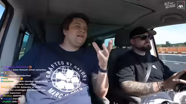 02:29:03Es wird angekündigt, dass der Metashishop live ist und Merch verkauft wird. Der Link wird in den Chat gespammt und angepinnt. Der Streamer lobt den Manager Jan für seine Arbeit. Es wird über den Merch gesprochen, der aus einem Baseballshirt, einem T-Shirt und einem Zipper besteht. Die Sachen sind oversize, daher wird empfohlen, eine Größe kleiner zu bestellen. Es wird kurz über den Europapark gesprochen, an dem sie vorbeifahren, aber sie dürfen dort nicht drehen. Der Streamer Mitashi wird als Angsthase bezeichnet, weil er keine Fahrgeschäfte fahren möchte. Es wird über frühere Erlebnisse bei der Red Bull Challenge gesprochen, wo Mitashi einen Höhenparcours nicht machen wollte. Vanessa gibt eine Eilmeldung, dass es im Shop nur noch 2XL gibt, die aber sehr groß ausfallen. Der Streamer wiegt 105 Kilo und trägt L. Es wird über grüne Nummernschilder diskutiert und spekuliert, dass es sich um ein Dubi handelt.
