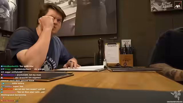 07:39:54Es wird die Freude darüber ausgedrückt, wieder mit dem Chat interagieren zu können, da man sich zuvor wie Fanboys verhalten habe. Es wird erwähnt, dass ein Schlüssel für Freunde benötigt wird und Tobi aufgefordert wird, auszusteigen. Ein Chat-Nutzer namens Dietz wird von den Mods für eine Stunde getimeout, weil er negativ aufgefallen ist. Es wird ein Giveaway für ein T-Shirt angekündigt, wobei das Codewort "SCAM" lautet. Es wird erklärt, dass es zwölf AXA T-Shirts zu gewinnen gibt und die Teilnehmer verschiedene Aufgaben erfüllen müssen, wie das Probieren von Käsesorten und das Finden von Bärenstatuen.