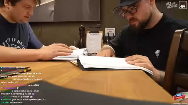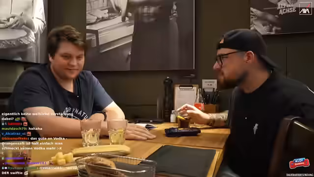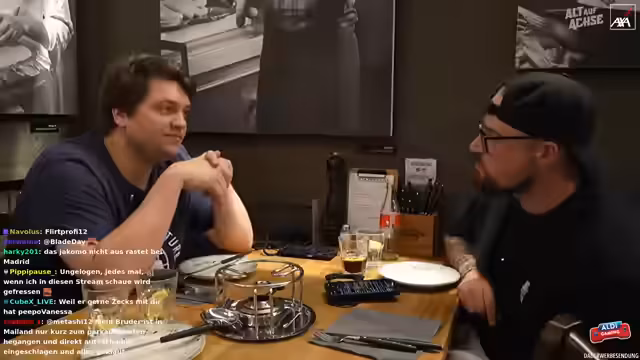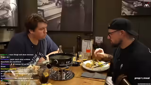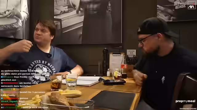 09:03:07Es werden zwei Käseplatten als Vorspeise bestellt. Der Streamer sucht sein Mikrofon. Es wird auf Jan angestoßen und seine Arbeit gelobt. Der Streamer würde Jan besser bezahlen, wenn er bei ihm wäre. Es wird gescherzt, dass Jan die Rechnung bezahlen soll. Der Streamer bietet an, das Fondue für alle zu bezahlen. Er entscheidet sich für das Cordon Bleu. Es wird über die Häufigkeit von Fürzen während der Fahrt gesprochen. Es wird überlegt, den Stream in einer Location früher anzumachen, um den Sonnenaufgang zu zeigen. Es wird überlegt, ein anderes Spiel als League zu spielen. Es wird überlegt, wo die Off-Kennplätze sind.