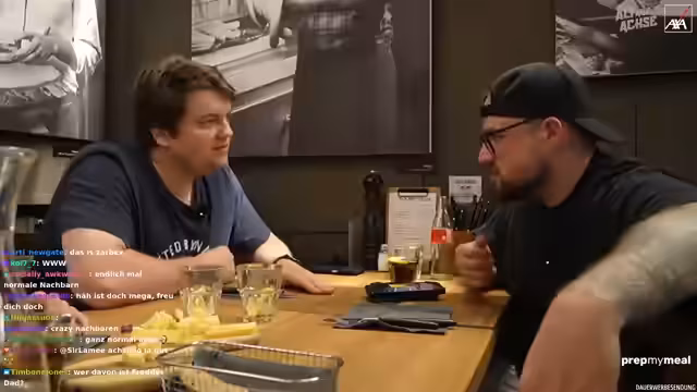 10:07:14Es wird über Paartherapie gewitzelt und ein Foto von der Mutter gezeigt. Es folgt eine Diskussion über ein BIOS-Update, das während eines Streams erforderlich war, was zu Stress und einem unerwarteten Stuhlgang führte. Es wird detailliert beschrieben, wie es dazu kam, dass Stuhl an die Arschbacke gelangte. Es wird eine Anekdote über eine unangenehme Erfahrung auf einer Zugtoilette erzählt, bei der der Penis das Wasser berührte. Dies führt zu entsetzten Reaktionen und dem Wunsch, das Thema zu wechseln. Es werden verschiedene Nachtischoptionen besprochen und die Karte wird erneut angefordert.