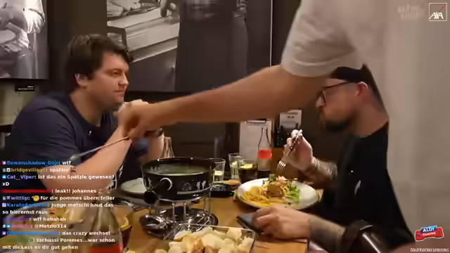 09:19:14Es wird über die Regeln beim Käsefondue gesprochen, insbesondere dass man es erst ab zwei Personen bestellen kann. Es wird empfohlen, das Lötschbergfondue mit gedämpften Kartoffeln zu kombinieren. Jeder soll einmal reindippen dürfen. Es wird überlegt, für drei Personen zu bestellen, damit jeder einen Löffel nehmen kann. Es wird die Freude über das viele Brot betont, das zum Fondue gehört. Freddy äußert, dass er noch nie so ein Gesicht wie beim Reden über Fondue oder League of Legends gesehen hat. Es wird eine Anekdote über ein aufgelöstes Schweiz-Verbot erzählt. Es wird über die Hygiene beim Fondue-Essen gesprochen, insbesondere wie man Speichelkontakt vermeidet. Es wird beschlossen, für vier Personen zu bestellen, wobei es Streit gibt, ob es zu viel sein wird.