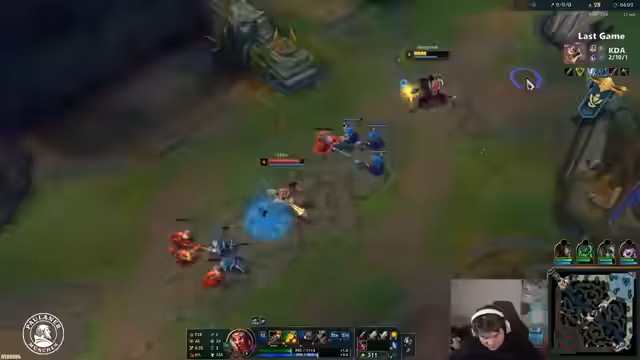 04:19:56Nachdem das Mid-Game begonnen hat, konzentriert sich der Streamer auf das Teamfokus. Das Team ist angeschlagen und schwach, weshalb versucht wird, Ressourcen zu sammeln und den gegnerischen Split-Push zu kontrollieren. Der Streamer selbst fühlt sich im Vergleich zur gegnerischen Vayne, die starkes Scaling hat, sehr schwach und hinterher. Er überlegt, ob er dem Team folgen soll, um in Teamfights etwas bewirken zu können. Sein Champion ist scaling-intensiv, weshalb Geduld und Ressourcenmanagement der Schlüssel zum Sieg sind.