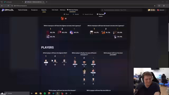 06:48:52Der Streamer wechselt das Thema zur laufenden League of Legends World Championship. Er geht auf die aktuelle Situation in der Swiss Stage ein, in der Teams wie Fanatic und PSG ausschieden und G2 und Gen.G weiterkamen. Es werden die anstehenden Spiele für den folgenden Tag diskutiert, darunter BLG gegen Top E-Sports und 100 Thieves gegen T1. Der Streamer gibt zu, dass seine eigenen Tipps und Prognosen für den Turnierverlauf ("Pick'em") komplett falsch waren, was die hohe Komplexität und Unvorhersehbarkeit des Turniers zeigt.