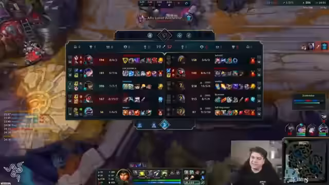 02:03:46Ein League of Legends-Spiel endet für das Team in einer Katastrophe. Gegen einen starken Gegner mit guter Ultimate-Nutzung verliert das Team trotz vorheriger Vorteile. Der Streamer zeigt sich frustriert über die vielen verfehlten Fähigkeiten und die Leistung des deutschen Panzers auf der Top-Lane. Trotzdem bleibt er optimistisch und hofft auf einen Sieg in der Serie und zukünftige bessere Spiele.