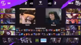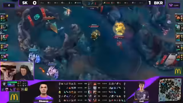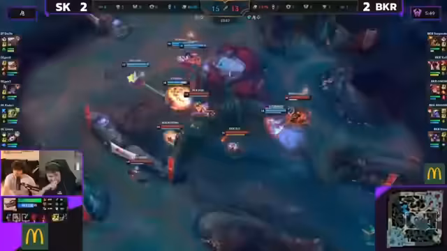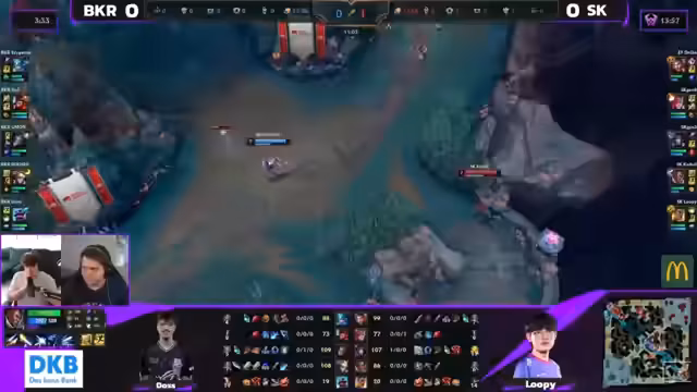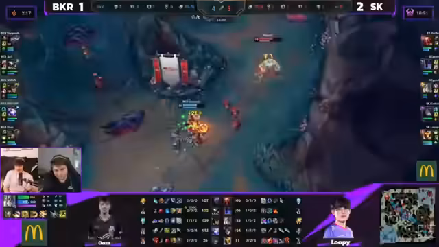 02:43:40BK Rock macht einen entscheidenden Fehler. Sie versuchen, einen 4-er Fight bei fehlenden Flashes zu forcieren, anstatt Dragon zu nehmen. Dies führt zu einem Desaster, in demBK Rock hohe Verluste erleidet. SK Rock mit starken Frontline-Champions wie Braum und Wukong kann den Fight gewinnen. BK Rock ist nun hinter und hat weniger Kontrolle über das Spiel.