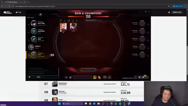00:08:06Nach einem spannenden und knappen Sieg, bei dem ein Smolder das Team im Late Game trägt, wird die aktuelle Position in der Grind-Challenge vorgestellt. Der Streamer ist auf Platz 9 gestiegen und gibt zum ersten Mal Punkte. Er äußert große Frustration über die Top-Lane, die er im Vergleich zur ADC-Position als extrem schwierig empfindet. Er fühlt sich isoliert und hat Schwierigkeiten, einen Impact auf das Spiel zu nehmen, da die Lane sehr abhängig vom Matchup ist und vom Jungler schwer zu beeinflussen ist.
