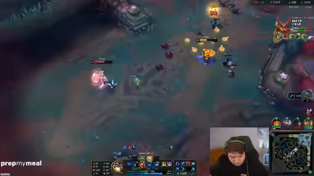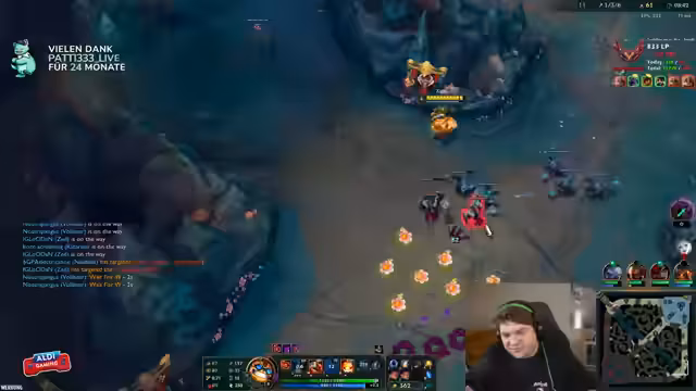 05:31:12Ein gegnerischer OTP (One Trick) namens Hemslug identifiziert sich, was den Streamer zu aggressivem Spiel gegen diesen auffordert. Er plant, den Gegner seitlich zu umgehen, doch ein Missverständnis in der Team-Kommunikation führt dazu, dass ein Kill nicht genutzt werden kann. Das Spiel bleibt trotz schwieriger Lage spielbar, da eine Welle erfolgreich genommen werden kann, was als 'Smooth-Win' für Vladimir beschrieben wird.