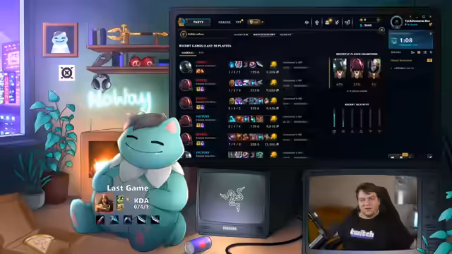 00:55:53Zwischen den Spielen wechselt der Fokus vom Gameplay zu persönlichen Themen. Der Streamer unterhält sich über seine Magic: The Gathering-Commander-Decks, zeigt seinen Katzen und erwähnt seinen baldigen, längeren Serveraufenthalt. Zudem diskutiert er die Qualität von Streams (1080p vs. 2K) und sein Vorhaben, auf allen Rollen Challenger zu werden, was er als sehr schwierig, insbesondere auf der AD-Carry-Position, beschreibt.