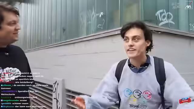 06:44:32Die Gruppe trifft auf Frederik, einen Einheimischen, der sich als Fan zu erkennen gibt und sie durch Heidelberg führt. Es wird über die Sehenswürdigkeiten der Stadt gesprochen, darunter die längste Einkaufsstraße Europas, wobei die Aussage jedoch angezweifelt wird. Frederik empfiehlt eine Eisdiele in der Nähe der Uni-Mensa. Während des Spaziergangs interviewt Giacomo Frederik, der sich als Jurastudent vorstellt. Es wird humorvoll über die Möglichkeit gesprochen, Frederik für rechtliche Angelegenheiten zu konsultieren, insbesondere im Hinblick auf das Falschparken auf dem Radweg. Frederik gibt Einblicke in das Studentenleben in Heidelberg und erwähnt die renommierte Universität. Es wird über die Schlossbeleuchtung gesprochen, die mehrmals im Jahr stattfindet, im Gegensatz zu Jans ursprünglicher Annahme. Frederik erklärt, dass die Altstadt bei solchen Veranstaltungen sehr voll ist und schätzt die Besucherzahl auf etwa 200.000. Er beschreibt Heidelberg als Touristenhochburg in Baden-Württemberg.