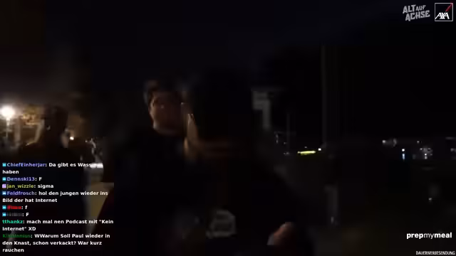 10:06:31Die Uhrzeit für das Feuerwerk rückt näher und die Gruppe schaltet in einen Aktionsmodus. Es wird ein neuer Akku für die Kamera getauscht und eine finale Position bezogen. Die Streamer nutzen die Zeit, um mit den Zuschauern zu interagieren, Abos und Follows zu lesen und die Vorfreude auf das Ereignis zu schüren. Eine Sidequest wird gestartet, bei der die Zuschauer durch Eingabe des Keywords "AXA" an einem T-Shirt-Gewinnspiel teilnehmen können.