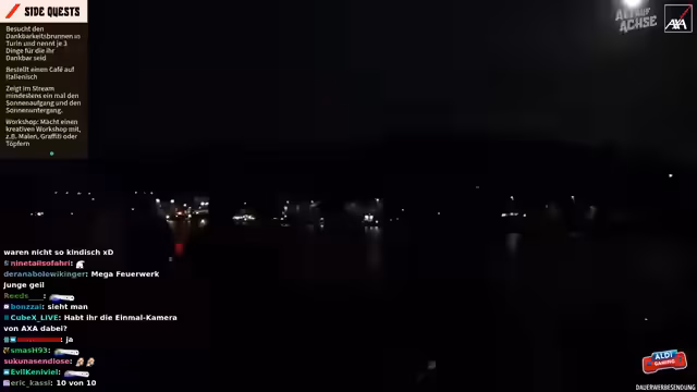 10:06:31Es wird besprochen, wie man sich am besten für das bevorstehende Feuerwerk positioniert und die Akkus der Kameras vorbereitet. Tobi und Vanessa sollen die Autos holen, während die Kamera auf das Feuerwerk gerichtet bleibt. Der Chat wird gefragt, wer auf das Feuerwerk gespannt ist. Der Streamer bedankt sich für Sub-Gifts und entschuldigt sich dafür, dass er diese nicht immer angemessen würdigen kann. Er betont seine Dankbarkeit und hofft, dass die Zuschauer dies verstehen. Es wird überlegt, ob man während des Feuerwerks schon losfahren soll, um dem Verkehrschaos zu entgehen. Der Plan ist, etwa 15 Minuten des Feuerwerks anzusehen und dann weiterzufahren. Es wird angekündigt, dass es morgen weitergeht.