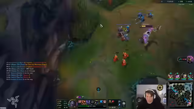 02:26:20Das Team erkennt eine gute Gelegenheit für einen Fight, da mehrere Gegner ohne wichtige Cooldowns wie Flash sind. Spieler von beiden Seiten positionieren sich für einen möglichen Konflikt um den Drachen. Es kommt zu einem chaotischen Teamkampf, bei dem der Spieler aktiv mit Ghost und Positionierung versucht, den gegnerischen Ashe zu eliminieren. Obwohl der Kampf knapp verläuft, kann das Team den Drachen sichern und weiter an Map-Kontrolle gewinnen, was zu einer emotionalen Reaktion im Chat führt.