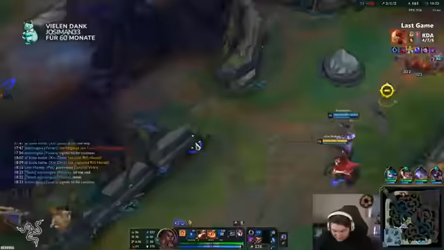 04:19:03Der Streamer fokussiert sich intensiv auf das Gameplay auf der Midlane. Er analysiert verschiedene Champions wie Alistair und Ludens, denkt über Item-Builds wie Torch oder Ludens nach und diskutiert mit dem Chat über die strategische Ausrichtung des Spiels. Er betont die Notwendigkeit, als Team zu gewinnen, und fühlt sich in der Rolle des Carrys, besonders vom Bot aus, verantwortlich. Es kommt zu einigen kritischen Fehlern, wie dem versehentlichen Kicken eines Mitspielers und der Analyse eines gescheiterten Trades.