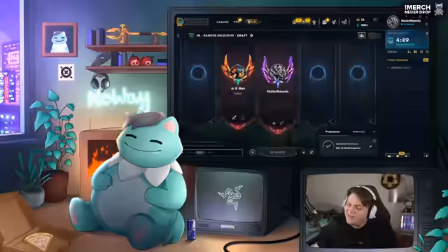 10:04:59Der Fokus verlagert sich auf das aktive Gameplay in League of Legends. Es werden verschiedene Champions und deren Synergien diskutiert, wie die starke Kombination aus Katarina und Graves. Die Gespräche über das aktuelle Match-up sind strategisch, beinhalten aber auch spontane Reaktionen auf das Geschehen im Spiel. Der Streamer analysiert die Team-Kompisitionen, den Zustand der Lanes und die Drakes, während er taktische Entscheidungen wie das Einnehmen des Herold oder das Kontrollieren des Raptor-Camps kommentiert und dabei teilweise frustriert auf setbacks reagiert.