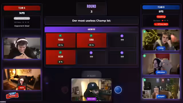 02:48:56Die Kategorie 'Most Useless Champ' löst hitzige Debatten aus. Yuumi wird mit 61% als Top-Antwort erraten, gefolgt von kontroversen Calls für Ivern, Zilean und Azir. Die Teams argumentieren über Low-Elo-Wahrnehmung versus objektiver Champ-Stärke, wobei Enchanter wie Soraka und 'Abfuck'-Champs wie Timo diskutiert werden. Ein strategischer Timo-Call (11%) sichert schließlich Punkte, obwohl der Champ ingame stark ist.