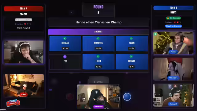 02:57:10In der Kategorie 'Hear-Me-Out-Champ' (unpopuläre attraktive Champions) werden Nami, Evelyn und Lilia genannt, wobei Nidalee (32%) überrascht. Bei tierischen Champs dominieren Nidalee, Warwick und Gnar, während Ari als 'zu menschlich' disqualifiziert wird. Die finale Runde fragt nach Streamern, die für fedende Olafs verantwortlich sind, mit Kev Strobl (73%) als Top-Antwort. Kreative Calls wie 'Kroko' und 'Basti G' führen zu chaoticen, aber unterhaltsamen Momenten.
