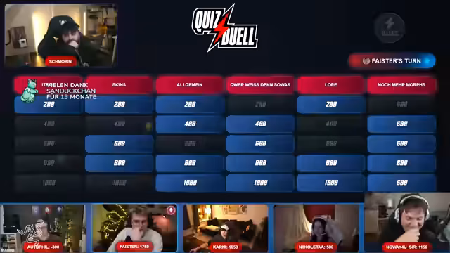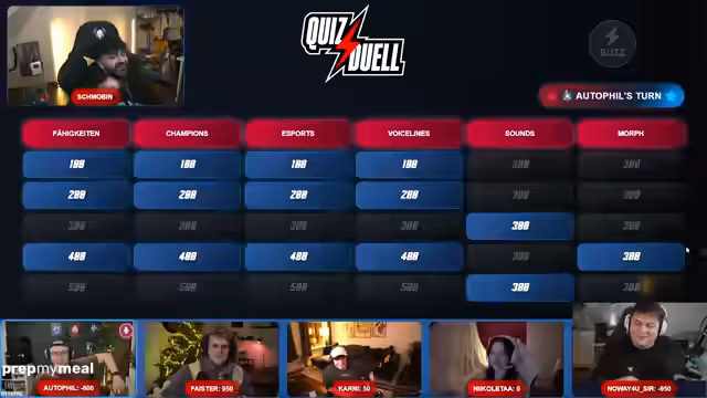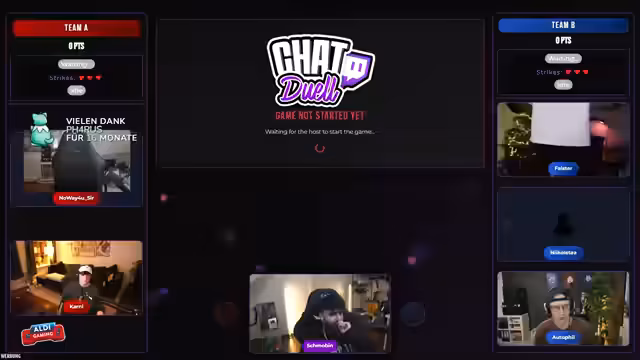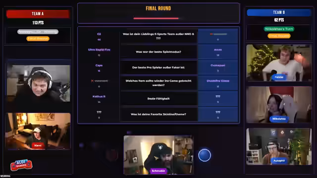 02:26:40Nach einer humorvollen Diskussion über Platzierungen (Noel erster, Feister zweiter) werden Teams nach Skill-Level gebildet: Noel, Feister und Nicoletta gegen Autofill und Kani. Die Teams diskutieren Strategien für die nächste Quizrunde, während Twitch Prime-Werbung eingeblendet wird. Die Stimmung bleibt locker, trotz technischer Hinweise zur Buzzer-Funktion. Ein besonderer Fokus liegt auf der Vorbereitung eines Face-Off-Formats, bei dem Zuschauerantworten erraten werden müssen.