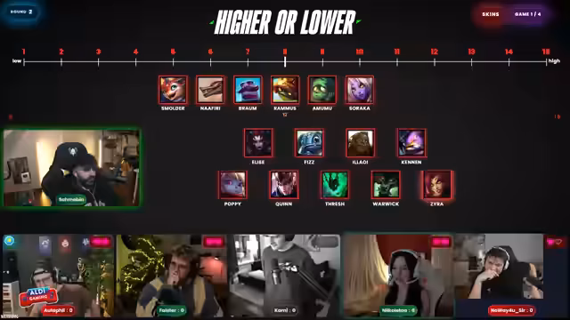 00:15:02Das Quiz beginnt mit der Kategorie 'Higher or Lower', bei der die Anzahl der Skins verschiedener Champions verglichen werden muss. Teilnehmer wie Phil, Kani und Nicoletta raten die Reihenfolge, wobei besonders Rammus mit 12 Skins für Verwirrung sorgt. Smolder wird als jüngerer Champion mit weniger Skins identifiziert. Diskussionen über Strategien und falsche Einschätzungen prägen die Runde.
