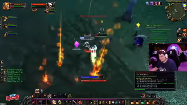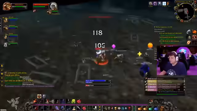 00:08:05Der Streamer arbeitet mit einer kleinen Gruppe von Mitspielern zusammen, um Quests zu erledigen. Es gibt Diskussionen über den Fortschritt der einzelnen Gruppenmitglieder und die Verteilung der Quests. Er plant, mit der Gruppe bald Dungeons wie 'Kral' und 'Gnomeregan' zu besuchen. Zudem gibt es einen Vorfall, bei dem ein Spieler eine Strafe vom Spiel erhält, weil ein Addon ihn blockiert und er es nicht schafft, es vom Bildschirm zu entfernen.