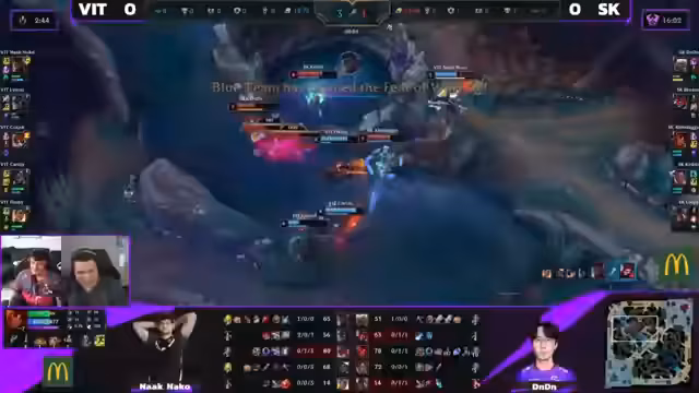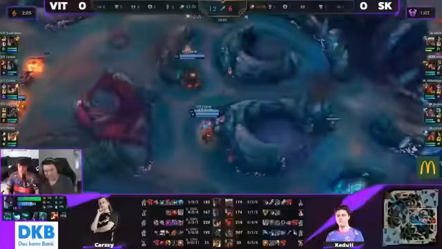 02:12:57Nachdem SK Gaming einen riesigen Fehler bei dem Versuch, den Baron Nashor zu stehlen, begeht, und dabei mehrere Spieler verliert, endet das Spiel unweigerlich. Der Streamer fasst zusammen, dass SK zwar gute Ansätze zeigte und früh im Spiel geführt hatte, aber letztlich durch wiederholte Fehlkalkulationen im entscheidenden Moment das Spiel aus der Hand gab. Er bewertet das Verhalten als sehr 'unschön' und konstatiert, dass es dem Team trotz guter Ansätze an reiner Exekution mangelt und es im entscheidenden Moment denkt.