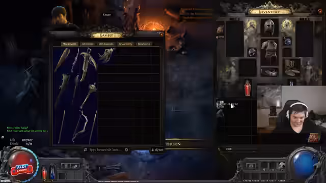 02:13:38Nach einem schwierigen Kampf und dem Gefühl, seine Ausrüstung sei unterperformend, beschließt der主播, einen Abstecher zu machen, um seine Items zu verbessern. Er besucht einen Händler und kauft einen 'Nettle Talisman', der 'Increased Attack Speed' und '+2 to all Melee Skills' bietet, was einen signifikanten Schadenanstieg verspricht. Anschließend findet er eine Exalted Orb, um sein Hauptitem, eine Klaue, aufzuwerten. Er fügt 'Increased Physical Damage' und 'Adds 8 to all Physical Damage' hinzu, was ihn als 'echten Brocken' bezeichnet und einen großen Durchbruch im Gameplay darstellt.