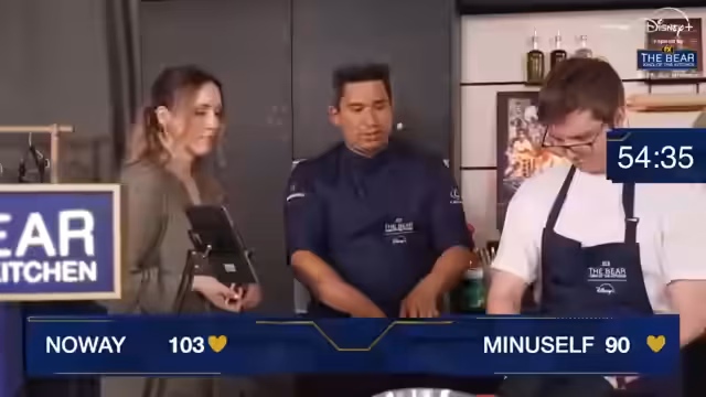 03:54:45Nach der Wertung des dritten Gangs wird das Gesamtergebnis des Koch-Battles präsentiert. Das Team München erreicht eine beeindruckende Gesamtpunktzahl von 80 von 90 möglichen Punkten und gewinnt damit knapp gegen Team Berlin. Der Stream endet mit einer Dankesnote an das Team, die Testesser, das Chat-Publikum und alle Helfer. Ein weiterer gemeinsamer Stream wird als Möglichkeit angedeutet. Die Ausstrahlung der neuen Staffel von 'The Bear' auf Disney+ wird beworben.