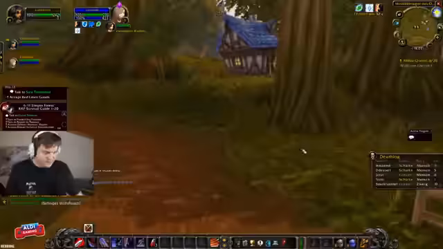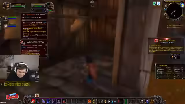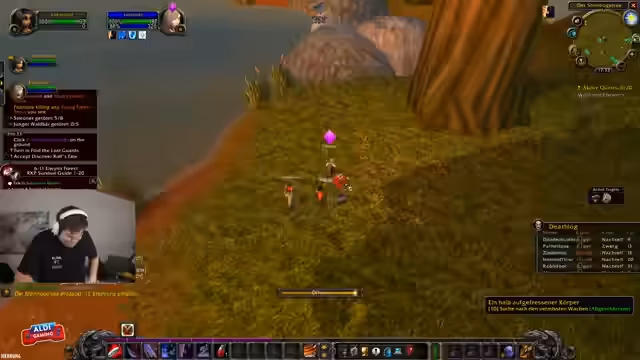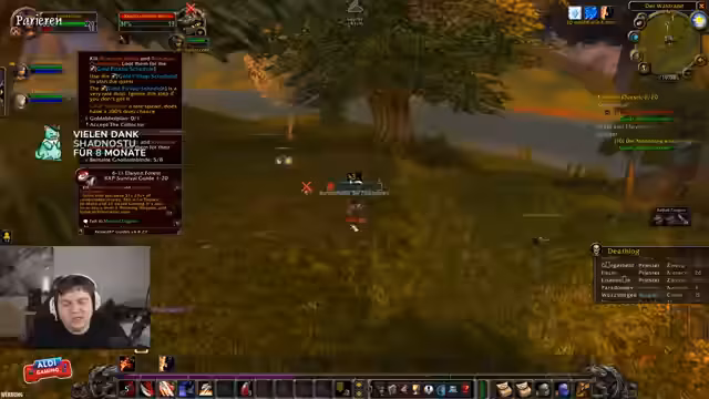 04:47:45Die Gruppe beginnt gezielt die Quest 'Hogger gesucht' abzuschließen. Es gibt Verwirrung über die Fähigkeiten des Kriegers, insbesondere ob und wie er den Boss Hogger, der immun gegen 'schieben' ist, kontrollieren kann. Der Streamer versucht, die Aggro zu ziehen und vom Rest der Gruppe zu halten, während seine Gruppe ihn heilt. Die Jagd auf Hogger wird durch die hohe Spielerdichte und das 'Camping' des Mops durch andere Spieler erschwert, was die Effizienz stark beeinträchtigt.