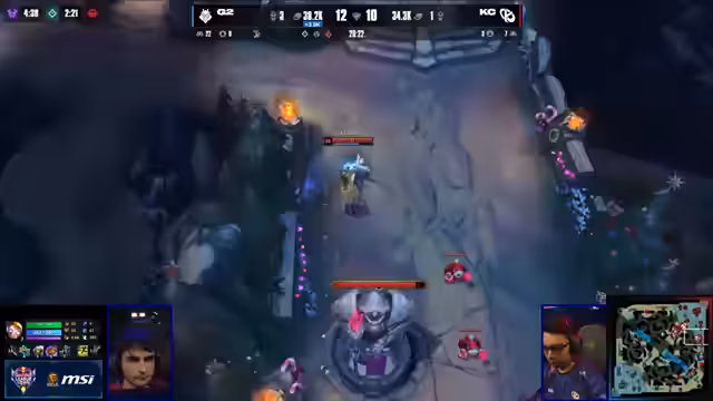 03:32:23Nach einem umkämpften Fight um den Soul-Dragon kehrt das Spiel in Richtung G2s Favorit. Broken Blade auf Aatrox zeigt sich als dominante Kraft, während KC Schwächen in ihren Teamfights offenbart. G2 nutzt dies und holt sich den Soul-Punkt. Dies führt dazu, dass KC das Spiel verlieren würde, sollte es hier scheitern, während G2 nun voller Selbstvertrauen agiert. Der Hype in der Arena ist spürbar, da der Gewinner das Privileg gegen T1 antreten wird.
