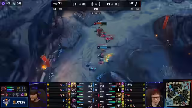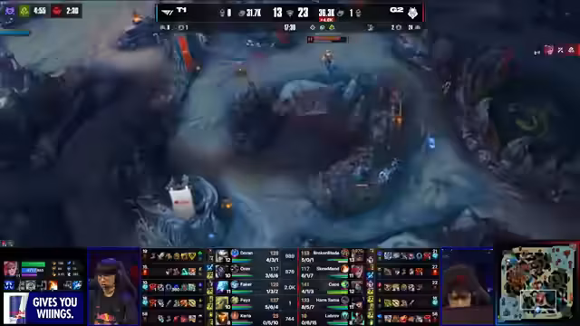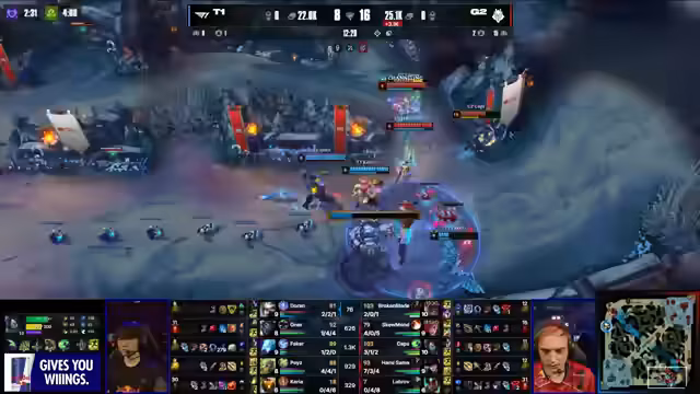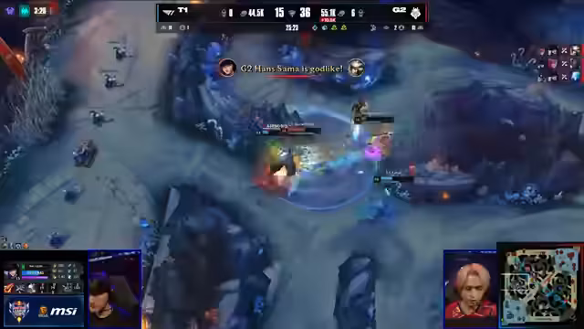 04:34:51G2 zeigt weiterhin eine starke Dominanz im Spiel, was sich in den Schilden und der Pace des Teams widerspiegelt. Die Hoffnung auf T1, aufzuholen, scheint gering, da Faker Schwierigkeiten hat, voranzukommen. Ein entscheidender Moment ist, als Hans Sama von Doran und Ohna angegriffen wird, aber durch eine geschickte Rettungsaktion von Caps überlebt. Caps' aggressive Spielweise wird hervorgehoben, als er einen Kill erzielt und dann mit einem Flash entkommt. G2 baut seinen Goldvorsprung auf 6000 aus, was als „ekelhafter Wert“ bezeichnet wird. Die Kommentatoren spekulieren über die Rache von T1, hoffen aber, dass G2 weiterhin die Oberhand behält. Es wird diskutiert, ob G2 den Baron Nashor auch ohne Akali Ult angreifen kann, da Caps sehr bluthungrig ist, aber keine Ult und keinen Flash hat.