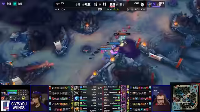 04:22:13Das Spiel entwickelt sich mit aggressivem Gameplay und intensiven Teamfights, die das Publikum begeistern. Die Botlane-Performance von G2 wird als 'disgusting' beschrieben, was auf die Dominanz und den hohen Schaden der Caitlyn-Karma-Kombination hindeutet. Ein entscheidender Teamfight am Drake führt zu einer Führung für G2, wobei die präzisen Skillshots und das schnelle Reagieren von Hans Sama hervorgehoben werden. Die Fähigkeit von Karma, lange gegen Mundo zu überleben, wird als beeindruckend bewertet, ebenso wie die perfekte Nutzung von Flashes und Spells durch Lavrov, um Hans Sama zu ermöglichen, Plays zu machen. Die fehlende Chance für Lillia in diesen Teamfights wird ebenfalls erwähnt. Die Zuschauer wünschen sich, dass solche aggressiven und spannenden Spiele auch bei den Worlds zu sehen wären. Die Konfidenz von G2 ist sehr hoch, da sie in diesem Match mithalten und sogar dominieren können. Die Toplane-Aktion führt zu einem Double Kill für G2, während Doran auf der Botlane zwei Gegner ausschaltet und somit der einzige Spieler bei T1 mit Goldvorteil ist.