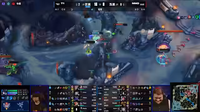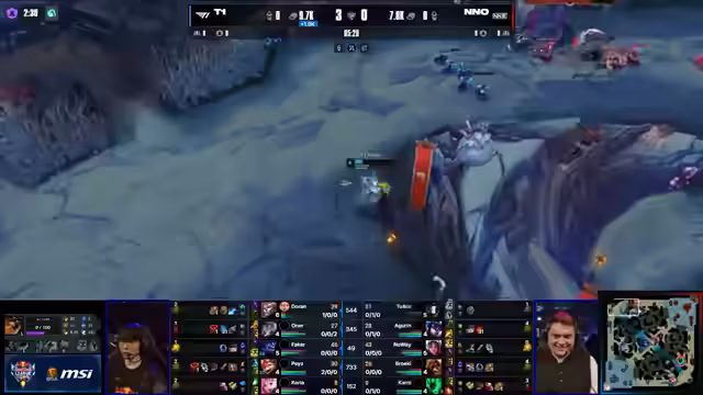 05:30:18Faker verliert Mana, was einen potenziellen Moment für Aggressionen schafft. Die Wave-Kontrolle ist für No Way schwierig, da er überextenden muss, um aggressiv zu spielen. Ein Gank von Briar wird als stumpf beschrieben, da sie hauptsächlich auf den Gegner zustürmt. Der Seraphine-Pick wird diskutiert, wobei Karni zugibt, dass es ihm nur um den Champion ging und nicht um die Team-Komposition. No Way schafft es, Faker in der Mid-Lane zu besiegen, was als großer Erfolg gefeiert wird. Trotzdem verläuft das Spiel für NNO nicht gut, da T1 einen deutlichen Goldvorsprung erzielt und aggressiv spielt. Aurelion Sol wird als extrem starker Champion beschrieben, dessen Fähigkeiten das Spiel stark beeinflussen. Die Teamkämpfe sind intensiv, und obwohl NNO einige gute Spielzüge zeigt, kann T1 den Vorsprung halten und gewinnt schließlich das Spiel. Die Spieler von NNO zeigen sich trotz der Niederlage zufrieden und hatten Spaß am Spiel.