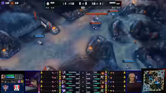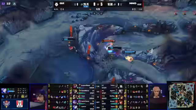 01:09:48Der erste Drake geht an G2, und es wird darüber nachgedacht, wie viel Vorsprung G2 als Showmatch-Gegner erhalten soll, um das Spiel spannend zu halten. Agurin erzielt einen Kill auf Ash, und Tolkien, obwohl Level 6, hat Schwierigkeiten. Der Farm ist identisch, was als unangenehm empfunden wird. Agurin gelingt ein beeindruckender Burst in einem 2-gegen-1-Kampf, was in einer Replay-Animation gezeigt wird. Kani versucht einen Engage auf Labrov, wird aber von Agurin erwischt. Trotz des Rückstands bleibt NNO optimistisch, da sie in der Vergangenheit bereits größere Goldrückstände aufgeholt haben. Ein Kill auf Caps wird gefeiert, aber Broken Blade revanchiert sich mit einem hohen Level. Bröki versucht einen Engage, wird aber von Hagrid gefeilt. Karni wird gefoltert und stirbt, was als herzlos empfunden wird. Der Shutdown-Gold geht an den Supporter, der als bester Spieler bezeichnet wird. Die Idee, dass Agurin von oben kollabiert, scheitert, und die Botlane von NNO gerät weiter unter Druck. Karni versucht erneut einen Engage, trifft aber versehentlich, was als das Schlimmste beschrieben wird, was einem Amumu passieren kann. Tolkien wird niedergeschossen, während G2 weiterhin die Kontrolle über das Spiel behält und den Rift Herald sichert. Der Goldrückstand von 7000 wird als Herausforderung, aber nicht als unüberwindbar für NNO angesehen.