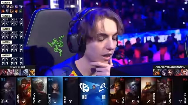 05:19:36Die Zuschauerreaktionen konzentrieren sich auf die Mimik der Spieler in der Menge. Es wird bekannt gegeben, dass Ouna erneut Briar spielen darf, während Argoin seinen schlechtesten Champion wählen muss. Briar war bereits in Berlin erfolgreich und wird nun zum zweiten Mal in einem offiziellen Spiel eingesetzt. Die Bans sind ungewöhnlich, da Mumu-Bahn, der bereits ausgeschieden ist, gebannt wird. Sahin wird den neuen Champion auf der Mid-Map spielen, was als cool empfunden wird. Bröcki deutet an, dass er eine ungewöhnliche Rolle als ADC übernehmen wird, was bei den Kommentatoren für Verwirrung sorgt. Die Nervosität ist spürbar, besonders bei Bröcki, der nicht glücklich aussieht. Die Cross-Talks sind vorübergehend deaktiviert, aber Sahin ist anwesend, obwohl Tolkien erwartet wurde. Die Diskussionen über die Champion-Picks, insbesondere von Agorin, zeigen, dass einige Entscheidungen als 'Bad Picks' angesehen werden, was die Spannung erhöht.