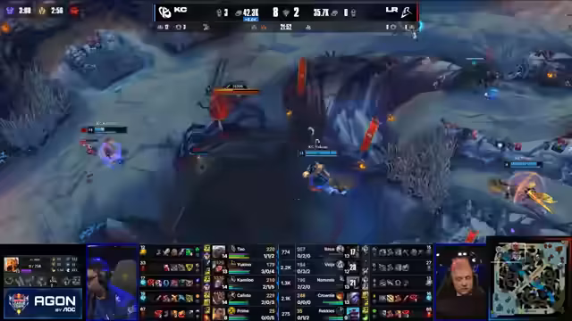 02:19:48Nach zwölf Minuten ohne Tötungen ereignet sich der erste Kill durch Frederica auf KC-Seite, was Los Raton in Führung bringt. Die Analysten bewerten den Zeitpunkt als ideal für Teamkämpfe, da nun auch Asier und Nettas Tuth kraftvolle Power-Spikes erreichen. Der erste Teamfight bei der Drake-Kontrolle folgt, bei dem KC durch präzises Positionieren und Patience mit der Orianna-Combo einen entscheidenden Kill erzielt und den Drake sichert, was als decisiv und sauber gespielt bewertet wird.