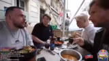 04:00:13Die Gruppe erreicht das mong Kok Restaurant und muss sich einen Tisch für sieben Personen suchen. Es gibt Schwierigkeiten, da der Tisch für zu viele Personen eingestellt ist und das Personal von der Kleidung und dem Verhalten der Gruppe eingeschüchtert scheint. Nach längerer Wartezeit wird schließlich ein kleinerer Tisch für die Gruppe organisiert. Die Männer bestellen koreanisches Essen wie Bibimbap und Tteokbokki. Der Streamer findet das Gericht anfangs etwas armselig, probiert es aber und stellt fest, dass es sehr lecker ist, auch wenn die Schärfe etwas mäßig ausfällt.