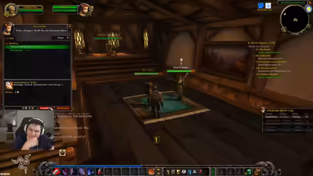 03:31:09Die Gruppe diskutiert den Einstieg in WoW, wobei der Fokus auf Bergbau und Schmiedekunst liegt. Der Streamer kauft eine Spitzhacke und lernt Bergbau, bemerkt aber Schwierigkeiten beim Überleben ('irgendwas mache ich massiv falsch'). Es folgen Tipps zur Nutzung von Gasthöfen für Rested XP und zur Interaktion mit Stadtwachen, um Lehrer oder Questziele zu finden. Die Notwendigkeit von Berufen wie Schmied zur Herstellung von Wetzsteinen für Gruppenbuffs wird hervorgehoben.