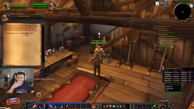 00:00:25Der Stream startet mit dem Beginn eines neuen Hardcore-Charakters, eines Warriors in Azeroth. Die ersten Minuten sind von der Einrichtung des Spielers, der Inventarverwaltung und der Suche nach Quests geprägt. Es gibt Schwierigkeiten bei der Anzeige von Questtexten und der Nutzung von Mods zur Automatisierung des Quests. Der Streamer erkundet die Startumgebung, tötet Gegner wie Tagelöhner und Diebe, und sucht nach der Questgiverin. Das Ziel ist, die Level-1-Quests abzuschließen und erste Ausrüstungs-Upgrades zu finden.