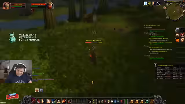 05:03:28Nachdem einige quests in Westfall absolviert wurden, nimmt der Streamer eine neue Quest an, bei der es darum geht, eine Prinzessin zu befreien. Das Gebiet gilt als gefährlich. Der Streamer beschäftigt sich mit dem Verhalten der Gegner, wie z.B. ihrer Fähigkeit, Hilfe zu holen. Zudem gibt es erste Erfahrungen mit PvP-Flaggen, die für Streamer nicht relevant sind, aber das Chat-Interesse wecken. Er stellt fest, dass die meisten Zuschauer ihn unterstützen und ihm nicht schaden wollen, und spekuliert über die Möglichkeiten, wie ein Streamer in Hardcore-Events getötet werden könnte.