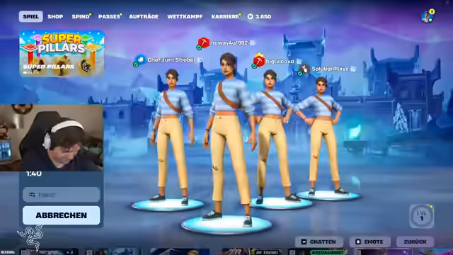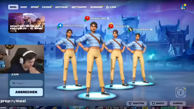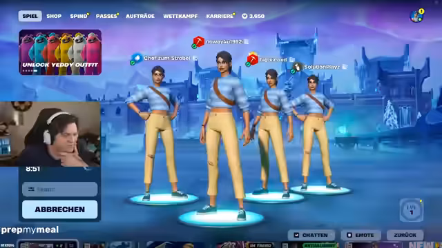 01:42:09Im Stream wird die Teamzusammenstellung für ein Fortnite-Turnier besprochen. Das Team besteht aus NoWay, Chef, Ravix und dem Streamer selbst, der als Hauptstrateg fungiert. Eine zentrale Strategiediskussion dreht sich um die Wahl der Skins: Der Streamer argumentiert, dass alle Teammitglieder identische Skins tragen sollten, um Gegner zu verwirden und zu verhindern, dass der schwächste Spieler sofort ins Visier genommen wird. Diese "Verwirrungsstrategie" soll einen Überraschungseffekt erzeugen und das Team im Spiel stärken.