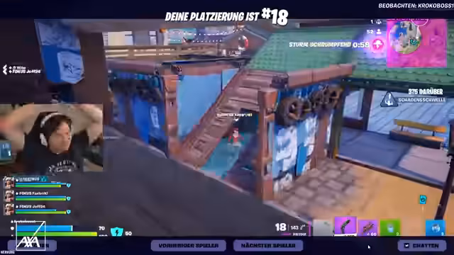03:15:36Der Fokus verlagert sich auf das aktuelle Fortnite-Spiel. Das Streamer-Team befindet sich auf Platz 16, was als gute Positionierung gewertet wird. Es wird auf die Notwendigkeit von Teamarbeit und Confidence betont, um Spiele zu gewinnen. Während des Spiels kommt es zu technischen Problemen wie einem plötzlichen Crash der Software, was zu Verwirrung führt. Ein plötzlicher Map-Drop wird kommentiert, was die Konzentration erfordert.