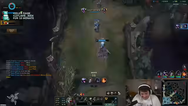 05:33:01In der ersten Hälfte des Streamings finden mehrere League of Legends-Spiele statt. Der Streamer analysiert seine Performance im Mid-Lane, oft nach einem schwierigen Start. Er beschreibt, wie er sich trotz anfänglicher Rückschläge wie einem 0-4 Score zurückkämpft und auf einen bestimmten Champion-Spike hinarbeitet. Dabei kritisiert er seine Playstyle, die als zu aggressiv bewertet wird, und kommt zum Schluss, dass das Spielverhalten des Supports den eigenen Schaden übertroffen habe. Ein Fokus liegt auf Champions wie Viktor, Ash und AP Shaco im Jungle, deren Builds und Item-Choices während des Spiels diskutiert werden.
