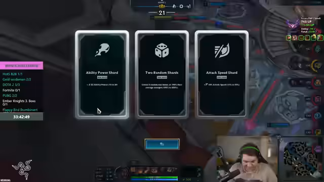 06:15:46Nach mehreren verlorenen Runden, bei denen der Streamer das Gefühl hatte, nichts zusammengepasst zu haben, wächst die Frustration über das Zufallsprinzip (RNG). Man ist sich unsicher, wie man gegen bestimmte Builds wie 'Cracklister' oder 'Nafiri' vorgehen soll, und vermisst entscheidende Gegen-items wie 'Flash'. Dennoch bleibt der spielerische Fokus erhalten, da das Spiel trotz Rückschlägen 'süchtig' macht und der Wille besteht, weiterzumachen, um in eine Buy-Runde zu kommen und die Stacks weiter aufzubauen.