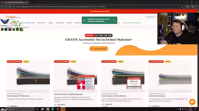 12:33:16Diamond wurde erreicht. Es wird sich für das Einschalten, die Follows und die Subs bedankt. Es wird auf die Emma Matratzen-Partnerschaft hingewiesen, da im Hotel keine Emma Matratze vorhanden ist. Es wird die Bequemlichkeit der Emma Matratze zu Hause gelobt und die Wichtigkeit von gutem Schlaf betont. Es wird erwähnt, dass man einen Topper zur Matratze hat. Es wird über die Größe der Kissen diskutiert. Es wird die Unterstützung durch Emma Matratzen erwähnt, die solche Reisen finanziell ermöglichen. Es wird sich bei allen bedankt und sich verabschiedet.