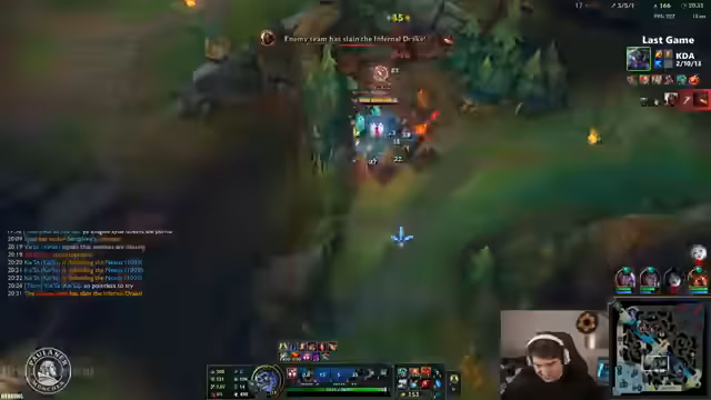 05:18:22Nachdem der Gegner den Nashor genommen hat, sieht das Team eine erneute Chance. Es wird ein Zug auf den Nashor gewagt, während der Gegner mit dem Drake beschäftigt ist. Ein spezifischer Teamfight im gegnerischen Jungle entbrennt, bei dem ein perfekt platziertes Shroom der eigenen Fiora und der gegnerischen Anivia einen entscheidenden Blow zufügt. Letztendlich gelingt es dem Team, den Nashor zu klauen, was die Schlüssel zum Sieg des Spiels darstellt. Der Streamer analysiert die glücklichen Umstände dieses Sieges.