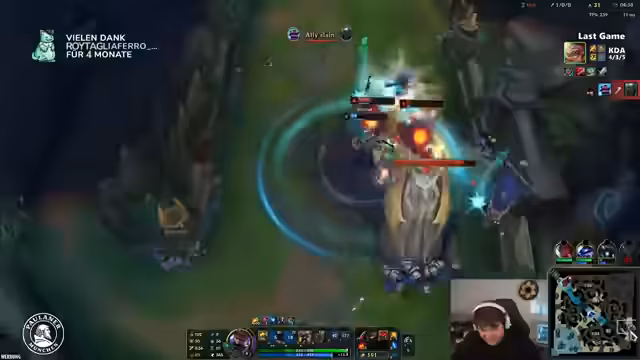 07:13:12Nachdem das Spiel gewonnen wurde, wird der gegnerische Kassadin für seine beeindruckende Leistung gelobt, die den Sieg des Teams ermöglicht hat. Der Streamer gibt zu, in diesem Game komplett vom Kassadin gecarried worden zu sein. Es folgt eine Reflexion über seinen Champion-Pool. Er erklärt, dass er Champions nur ab und zu testet, um Abwechslung für das Publikum zu bieten, aber dass dies den Aufstieg in höhere Elohierarchien verlangsamt. Der Fokus liegt weiterhin auf der Steigerung der eigenen Performance.