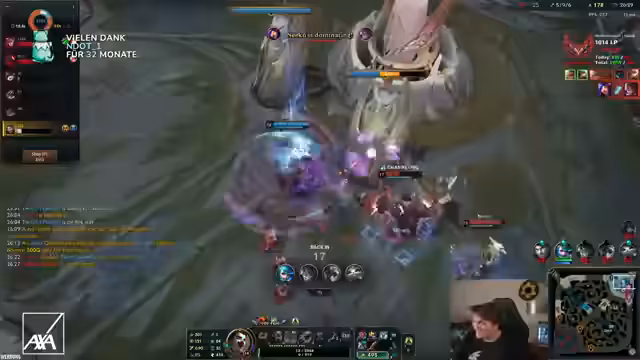 05:20:08Das Spiel wird geprägt von strategischen Entscheidungen wie dem contesteden Nashor und der Rückholung der Botlane. Der Streamer lobt die Stärke seines Mitspielers 'Bart', der 'solo' alles mache. Auch wird die Präsenz von Zuschauern erwähnt und der Dank für den Support ausgesprochen, was die Communitybindung zeigt.