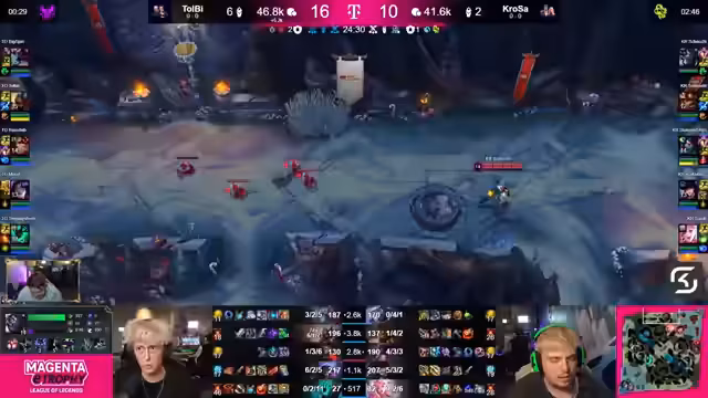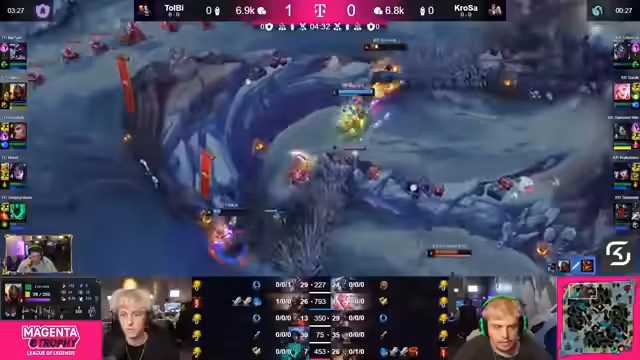 02:01:17Das erste Spiel zwischen Team Tolby und KrokoSara beginnt mit einem aggressiven Draft von Tolby, der den starken Split-Pusher Wukong early pickt. Ingame zeigt sich eine klare Überlegenheit von Tolby, der durch strategisches Rotieren und objektives Spiel sofort Vorteile herausarbeitet. Insbesondere der Top-Laner Tolkien dominiert seine Lane, was ihm einen erheblichen Vorteil in Gold und Erfahrung verschafft. Das Spiel entwickelt sich zu einem klaren One-Sided-Favoriten für Tolby, das seine taktische Überlegenheit im Early-Game festigt.